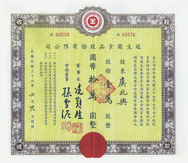 冼冠生傾力經(jīng)營(yíng),確立了“揚(yáng)己所長(zhǎng)”、“人無我有”、“真工實(shí)料”的經(jīng)營(yíng)思想。1918年,為適應(yīng)發(fā)展需要,改組為冠生園股份有限公司,公司投資十萬(wàn)元國(guó)幣,開設(shè)了局門路的工廠,擴(kuò)大糖果、餅干的生產(chǎn)。一改本市自產(chǎn)自銷為主的局面,面向外地推廣產(chǎn)品。