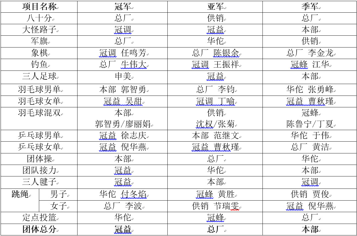 本次體育節共有九支隊伍參與角逐16個項目(乒乓球比賽男子單打、乒乓球比賽女子單打、三人足球比賽、釣魚比賽、三人踢毽子比賽、跳繩比賽、定點投籃比賽、棋牌類八十分比賽、棋牌類大怪路子、棋牌類四國軍棋比賽、棋牌類象棋比賽、羽毛球男子單打比賽、羽毛球女子單打比賽、羽毛球混合雙打比賽、團體操比賽、團體接力賽)的冠亞季軍以及一個團體總分冠亞季軍。運動員與裁判員本著體育競賽“公平公正”的原則,發揚了“友誼第一、比賽第二”的競賽精神,賽出了水平,賽出了風格,賽出了冠生園人的精神!