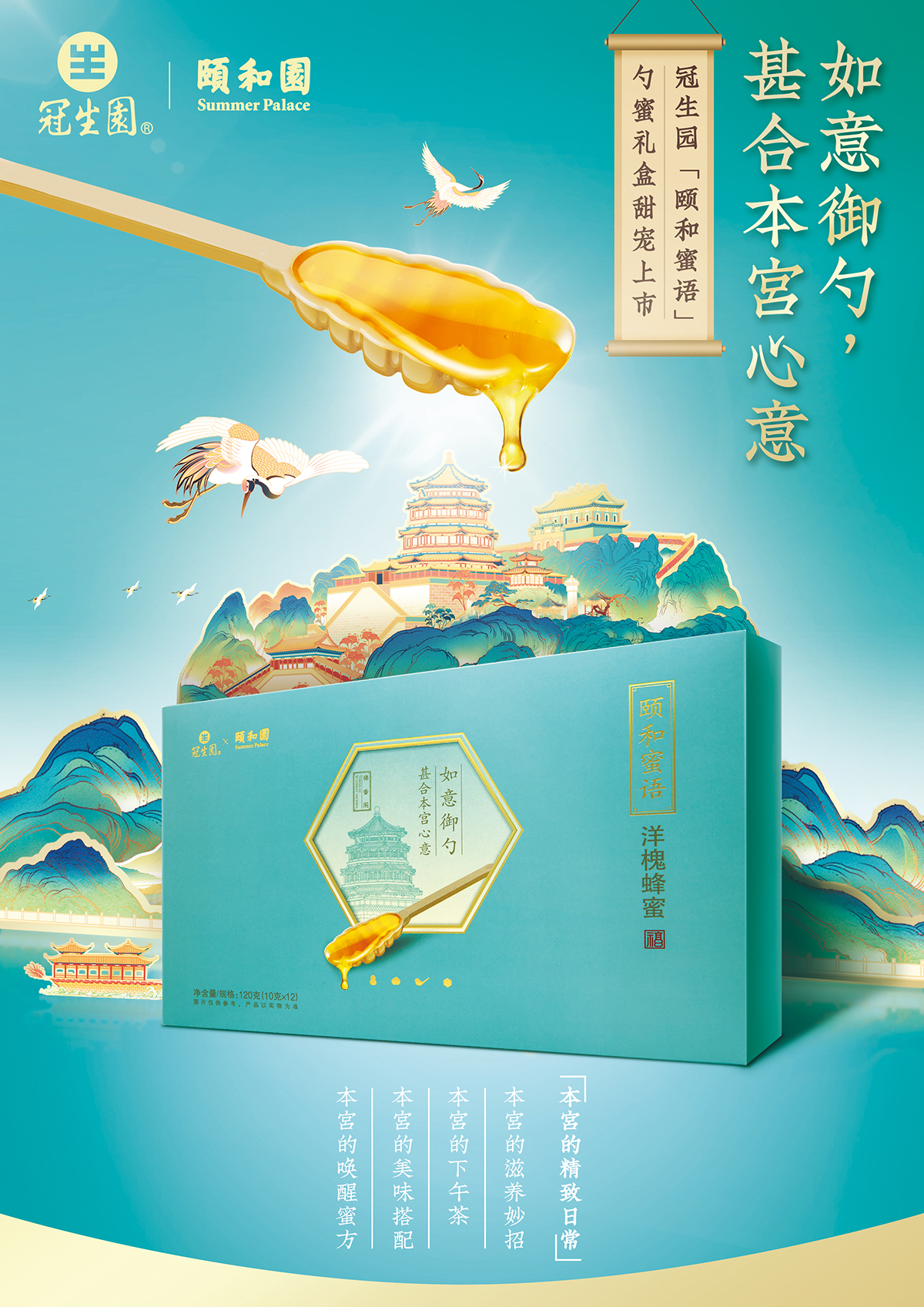 冠生園與頤和園,一個是百年老字號,一個是清代皇家園林,此次“兩園”共同推出的「頤和蜜語」,將蜂蜜的甜潤與頤和園的精致甜蜜融于一“勺”,讓消費者可時刻享受“頤式感”滿滿的精致生活體驗。